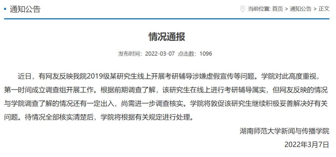 今年三月,有微博网友指出湖南师范大学一研究生开设考研辅导班,涉嫌虚假宣传,涉及金额近百万,学生们要求退款道歉。3月7日,学校在网站发布通报表示正在核实情况。