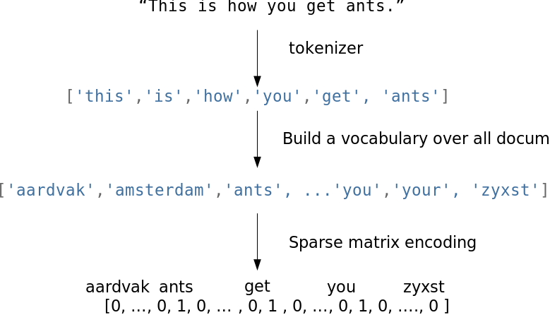 当我们将文档转换为单词序列之后,我们可以用向量表示它。最简单的方法是词袋(Bag of Words):我们创建一个长度等于字典的向量,计算每个单词出现在文本中的次数,然后将次数放入向量中对应的位置。用代码来表述更为简单明了: