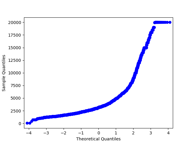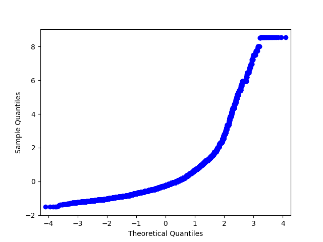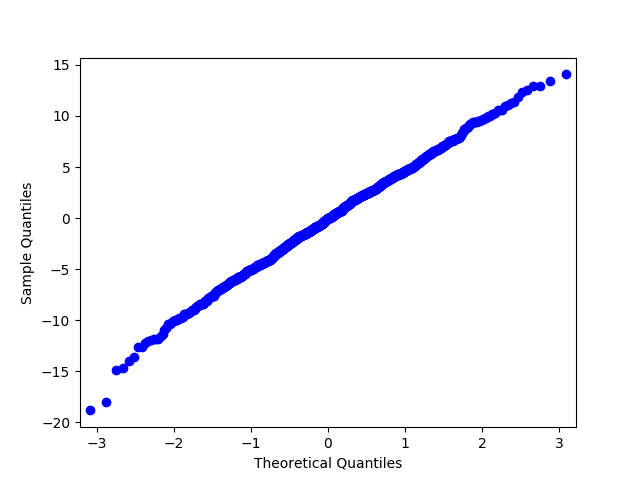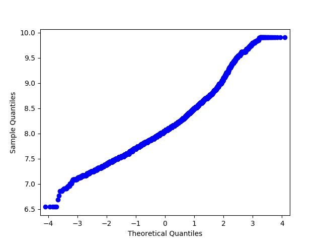 在以上的例子中,我们处理的是合成数据,并使用夏皮罗-威尔克检验严格地测试正态分布。下面让我们查看一些真实数据,并使用不那么形式化的方法测试正态分布——分位图(Q-Q plot)。正态分布的分位图看起来像一条平滑的对角线,而可视的异常值应该能够被直观地理解。