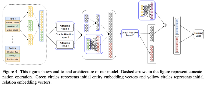 Nathani等人[30]介绍了一种基于图谱注意力网络(graph attention networks,GAT)的知识图谱嵌入方法,该方法在注意力机制中考虑了结点(node)和边缘(edge)的特征。作者采用了多头注意力架构(multi-head attention architecture),并重点强调了学习关系表示。论文中对四个数据集(WN18RR、FB15k-237、NELL-995、Kinship)进行的基准测试中显著提高了SOTA性能。实际上,这种方法要比ACL会议上同一天展示的(下面介绍的)另外一个方法要更好。
