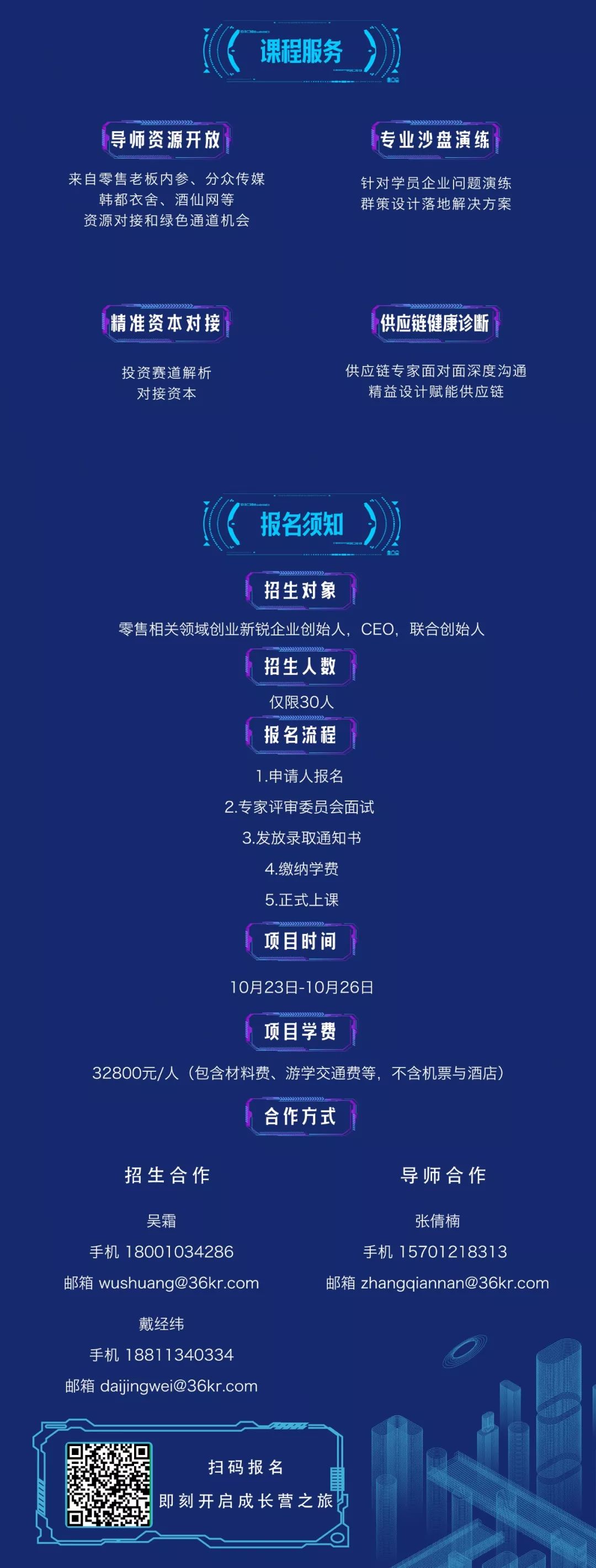 36氪联合《零售老板内参》联合打造的新零售卓越成长营,集合双方平台的行业大咖、实战导师、新零售社群与资本资源等,以闭门课程、实战演练、团队共创、明星企业游学的方式,助力新零售的企业实现卓越增长。