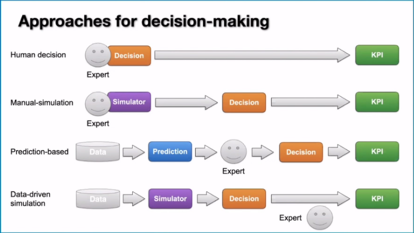 实际上在真实的系统里面已经看到从高到低这个规则已经不是一个最优的规则了。实际上我们在用预测来解决决策问题的时候,中间都有一个转换。但是如果我们把第二种方式和第三种方式进行对比就会发现第三种方式很好的一个地方就在于它是从数据出发的,当环境发生变化时,它能够适应得上,但是它的缺陷就在于他没有办法去寻优,没有办法自己去寻优,因为它没有一个模拟的环境。