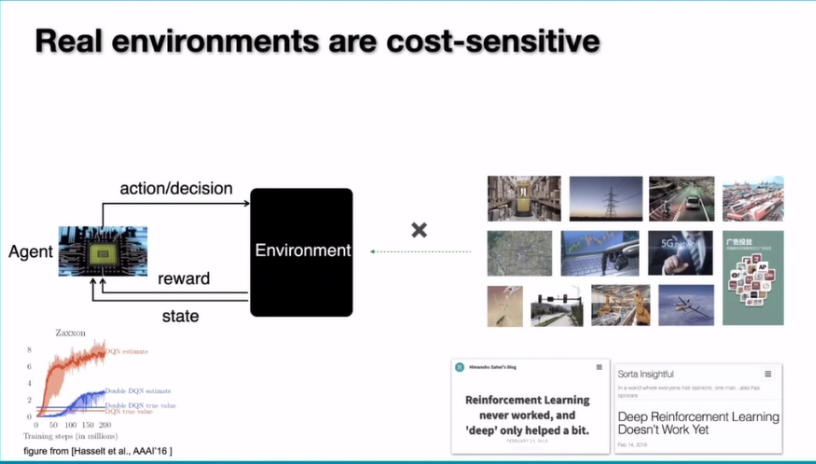 那么我们能不能直接把强化学习用在这样的环境里面呢?实际上如果我们去看任何一个强化学习运行的过程,我们都会发现它需要很多的探索。所谓的探索就是我们要去试错,所以这也引来了前段时间对于强化学习能不能用的这么一些批评,有些观点认为它不能用,其实不能用主要指的是它在真实的环境里面很难用,但是在游戏这种封闭环境下面其实都是很好用的,而且能够达到很好的效果。