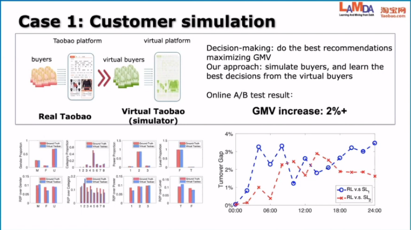 实际上在上图右下角显示的就是真实的淘宝数据分布和我们的模拟器里面生成的数据分布,红色的是真实的,蓝色的是模拟器的,可以看到它们已经比较接近了。所以我们当时也是把模拟器里面训练出来的决策的模型,比如说怎么去做推荐的模型,直接放到了真实的环境下面去做测试。AB测试的结果显示处比最好的baseline提高了两个百分点。所以这个可以看得到我们即使是没有做任何的迁移、没有做任何的环境的扰动这些事情就直接把这个模型拿出来,也是在一定程度上是可以用的。