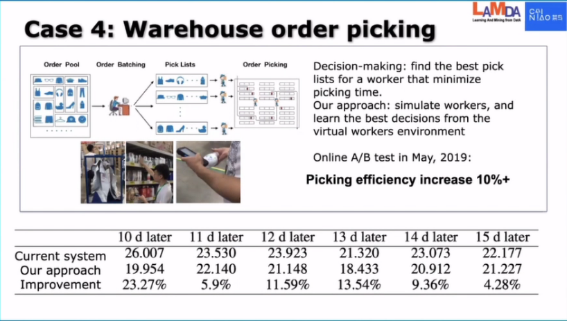 比如说工人拿货的时候有不同的高度,这个货物有不同的重量和不同的形状,这些实际上都会影响他拣货的效率。如果我们只是看地图的路径长度,则就会忽略掉这些因素。所以用我们的方法来做的时候,也是从数据上面去把这个功能给还原出来,所以我们就会有虚拟的功能,然后我们就给虚拟的工人来派单,然后看这个虚拟功能它怎么派会完成的时间会最少。这个事情做完了以后,我们去年5月份的时候在这个仓库里面做了对比实验。这个对比就是现有的系统派一单、我们的系统派一单,对比的6天下来,我们可以看到上面的数字显示的是:针对每一个商品,工人去拣货平均下来的时间是多少秒?6天平均完以后,我们可以看到我们的效率提升了10%以上。