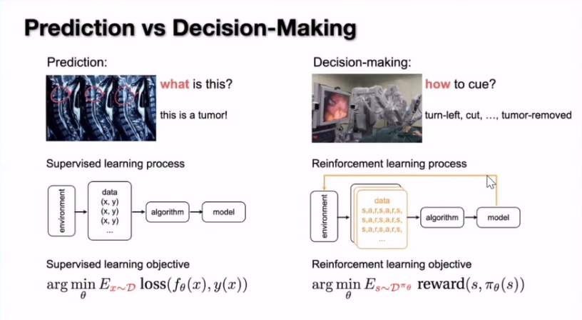 强化学习其实就是用来处理这样的决策任务,如果把它和监督学习做预测进行对比,那么我们主要回答的是怎么做,怎么做才能达到我们的目标,不同的任务就会导致我们的整个算法流程会有很大的不一样。