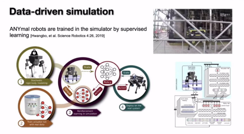 那么是不是可以用监督学习来帮我们把模拟器建好?实际上在一些情况下面是可以的,比如说这个是去年一个做机器人的工作。这个机器人的实体控制靠收集的大量数据,然后从它的数据上去做一个监督学习,来把这个模型还原出来,然后再在还原出来的模拟器里面学会怎么去控制机器人。结果它的控制会变得像生物一样更自然一些。