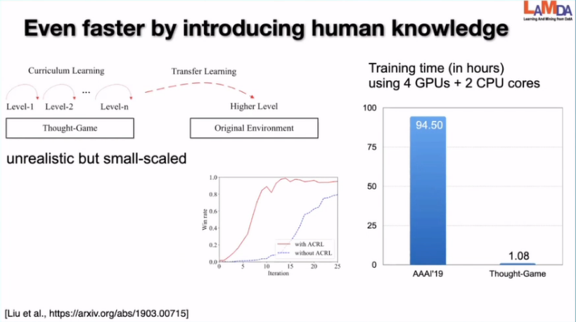 另外虽然人工的模拟器不是很准确,但是也能够给我们的学习进行加速。之前我们做过这样一个工作:在新机的环境下把各种强化学习的技术整合起来,来看我们能够把这个问题解决的多快。之前在19年的工作中,我们做过在训练两天后,能在一台计算机上面打败它的内置AI的这样一个实验。