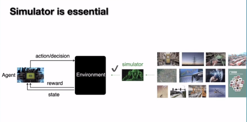 如果想把它用在一个真实业务上面,我们就会面临很大的问题。首先需要强调的是很多业务问题、很多真实的应用都是需要做决策的。如果我们确实能够把现在做决策的这种能力放到各种应用中去,那么就能够比人做的好、比专家做的还好,那么我们自然会有很大的收益。但是如果我们去看具体的这些应用时,我们会发现它和打游戏很不一样的地方就是我们没有一个现成的做好的一个环境,在真实业务中的环境都是一些真实、开放的、一些边界不那么确定的一些环境。