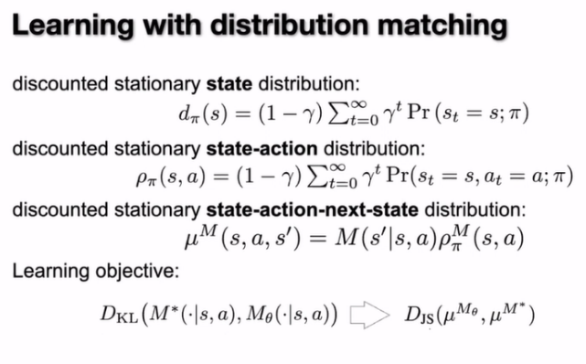 如果只看状态那就是上图第一行的stationary state distribution,如果看状态和动作的,就是第二行的样子,如果再把这个模型的某一步的转移概率加上去就是state-action-next-state distribution。所以这里我们发现我们其实可以把我们的目标从简单的监督学习换成 distribution的matching,主要是做后面这一个matching也就是state-action-next-state distribution matching。