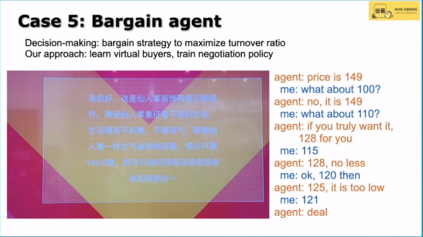 这个是当时在云栖大会上的一个展示,这里面还涉及到一些别的像自然语言处理不是我们做的,我们做的是里面的砍价策略。当对方出了一个价之后,我们要决定是卖了还是说我们要还一点价。所以我们这个实验做完了以后,我们和人去比砍价,要比历史数据上面的成交率提高一倍。
