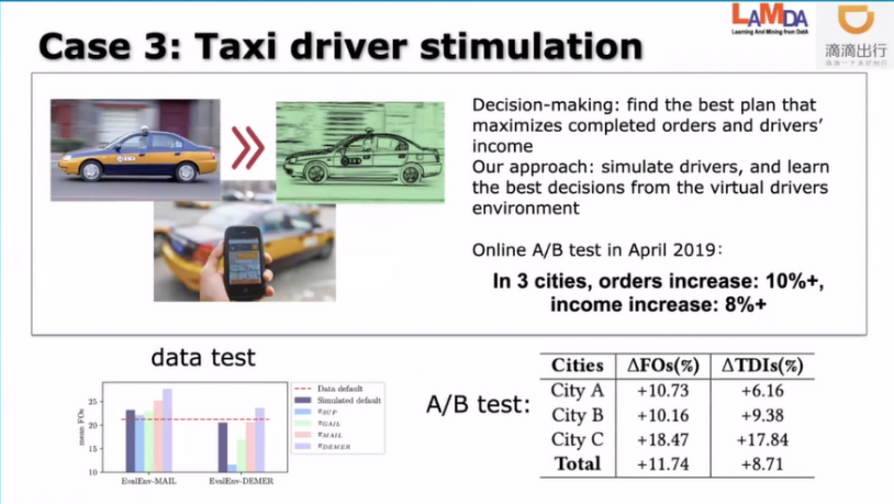 我们从历史的数据里面去把司机的虚拟模型学出来,这就是我们的模拟器。然后我们在模拟器里面给司机安排一些程序使得司机的收入能够提高。我们在去年4月份的时候完成了这个事情的线上测试,在线下的我们自己测试的时候差不多提高了13个点左右的完单量,然后在线上测试实际上提高了11个点多的完单量,同时还提高了司机的8%的这么一个收入,这也是一个有意义的应用环境。