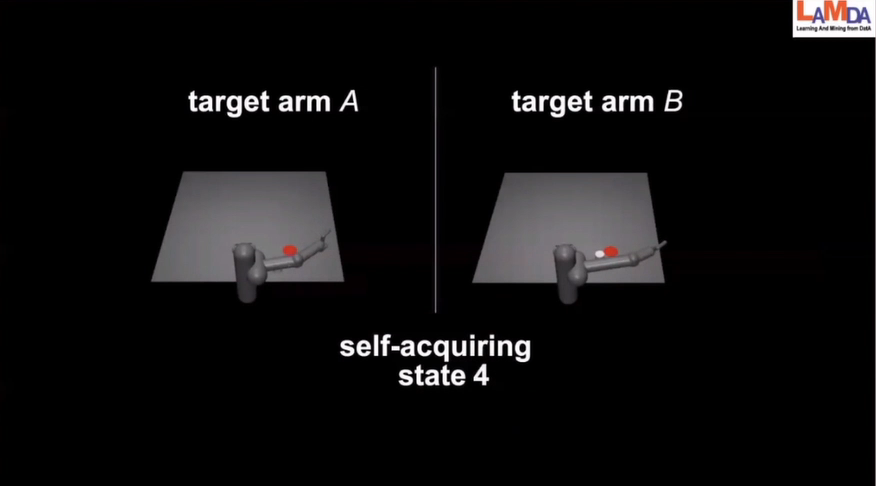 比如说上图左右是两个不同的手臂,刚才执行的5个动作就是在试探这个手臂到底是多长,实际上它并不知道手臂有多长,那么做了5个动作的适应以后就可以完成这个问题了。也就是我们把经验的模型重用起来来完成这个任务。可以看到,使用这样的方法之后,我们在环境里面做少量的几个试探后就可以一定程度的完成任务。 但是如果我们从头来训练这个任务,可能需要上百万的试错才能完成。所以这是一种能够利用人工的模拟器方式。