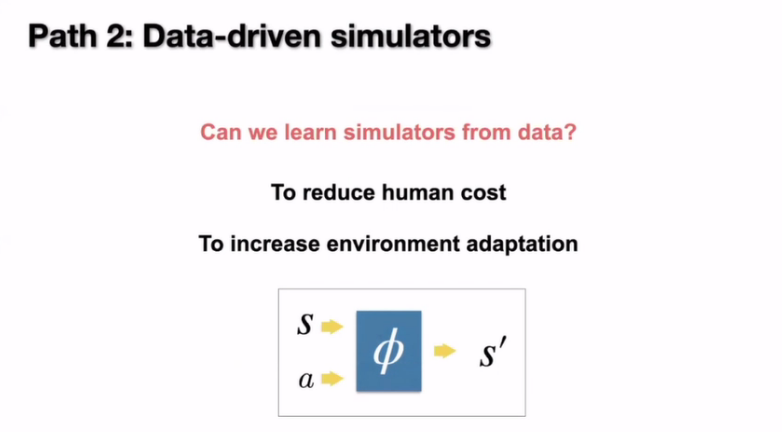 但是同时我们还在想,如果模拟器一直是人工设置的,那它会面临很多问题。第一个就是在人工设置的过程中人力开销是很大的,另外一个就是人工设置的模拟器都定下来以后不能很好地跟随环境的变化而变化。所以如果我们能够从数据上面还原模拟器,就可以缓解这两个问题。
