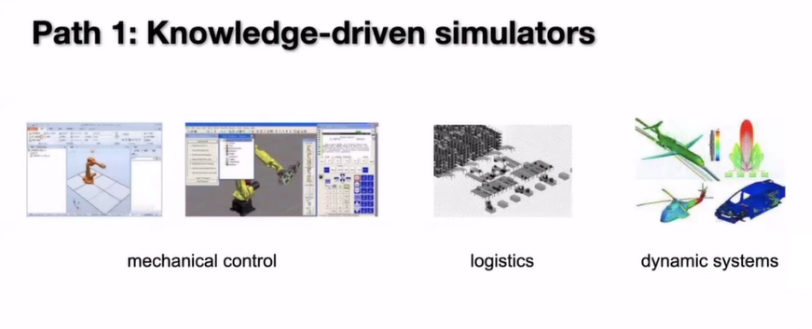 那么如何得到这样一个模拟器,如何让我们的模拟器能够和我们的真实环境对应上?实际上这并不是一个很新鲜的事情。我们可以看到在制造业和工业界里面有大量的模拟器的工作,所以以往的模拟器大部分是基于人类的知识来进行构造的,也就是用人工来构造的。里面包括比较常见的机器人控制、流体动力学、物流:我们可以把物流的整个场景虚拟的建模出来;上面这些已经有很多人研究了很多年,其实就是为了把里面的动力学模拟做的又快又准。