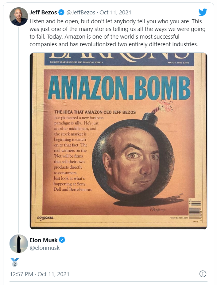 以马斯克的张扬性格,当了全球首富,不秀一波是不可能的。向谁秀最有节目效果呢?当然莫过于之前的全球首富贝索斯了。