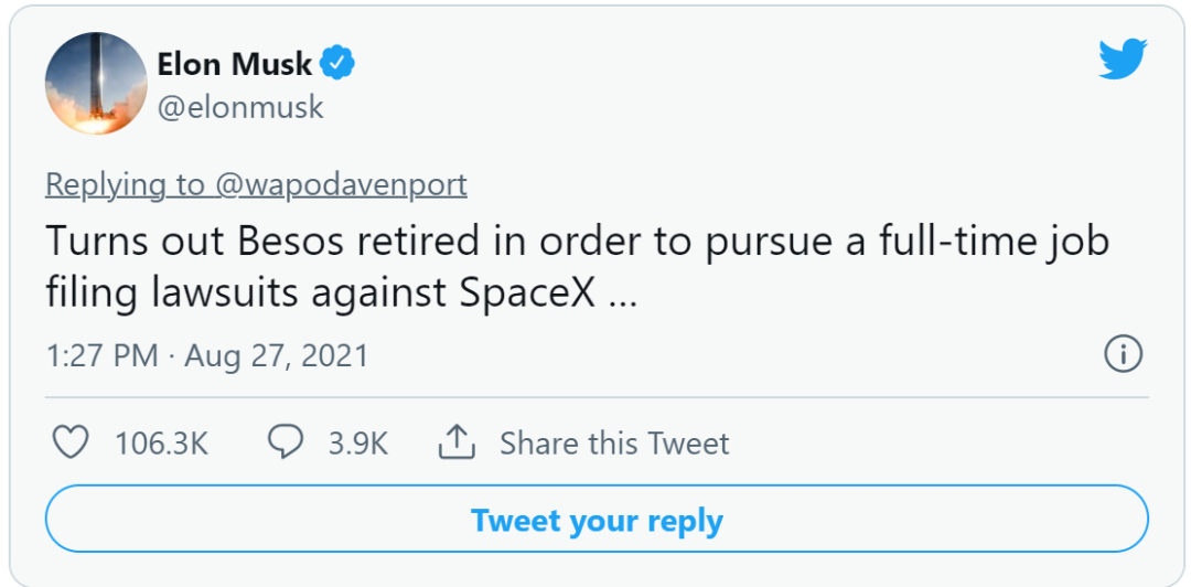 马斯克9月1号也推特上讽刺贝索斯的做法「他今年平均每16天就向SpaceX提出异议,对SpaceX提起法律诉讼才是他的全职工作吧」。