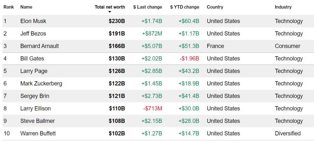 这份榜单显示,50 岁的马斯克的净资产达到了惊人的 2300 亿美元,排名高居榜首。盖茨以 1300 亿美元排名第四,巴菲特以 1020 亿美元排名第十。而这两位都曾经当过世界首富。