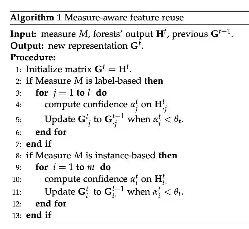如前面所述,给定一个实例,森林将产生对标签分布的估计值,可以将其视为属于每个标签的实例的置信度。在每一层中学习的表示将采用可度量的特性重用,并将原始输入特性输入到下一层。具有丰富标签信息的实值表示将被输入到下一层,以便MLDF更好地利用标签相关性。