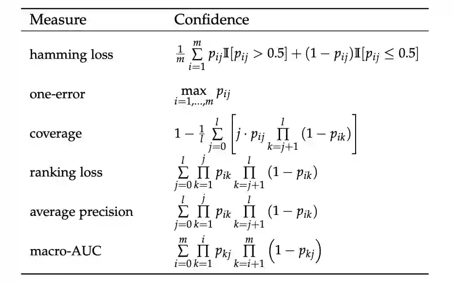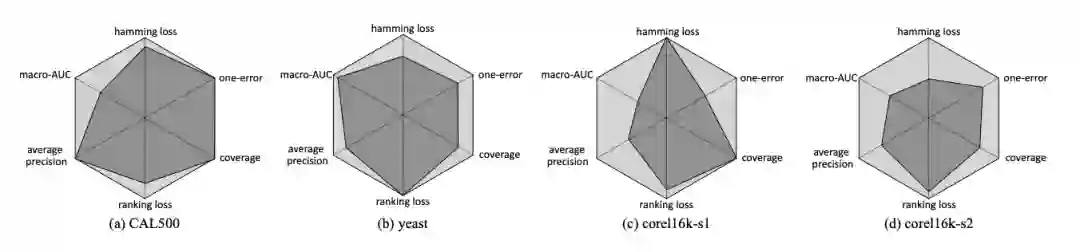 由于多标签学习中的评估比传统的分类任务更复杂,因此有多种性能度量方法[Schapire and Singer, 2000]。值得注意的是,不同的用户有不同的需求,不同的算法在不同的度量上的表现也不同。