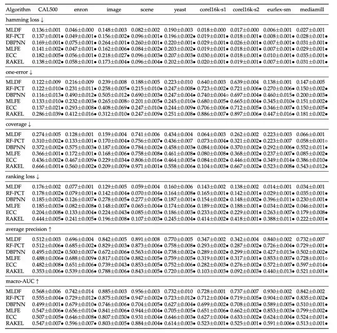 表4:9个数据集上每种比较方法的预测性能(均值±标准差)。•(◦)表明在95%显著水平,MLDF明显优于(差于)基于paired t-test 的比较方法。↓(↑)表示值越小(越大),性能越好。