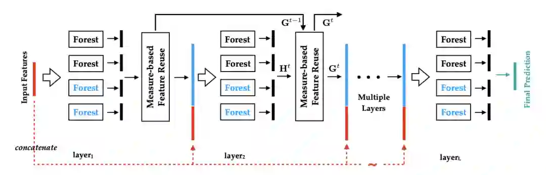 预测过程可以总结如下。如图1所示,假设森林已经很好地拟合了。首先,我们将实例预处理为标准矩阵X。其次,实例矩阵X通过第一层,得到表示H¹。通过度量感知特性的重用,我们可以得到G¹。然后我们将G¹与原始输入特性X连接起来,并将它们放到下一层。在多层之后,我们得到了最终的预测。