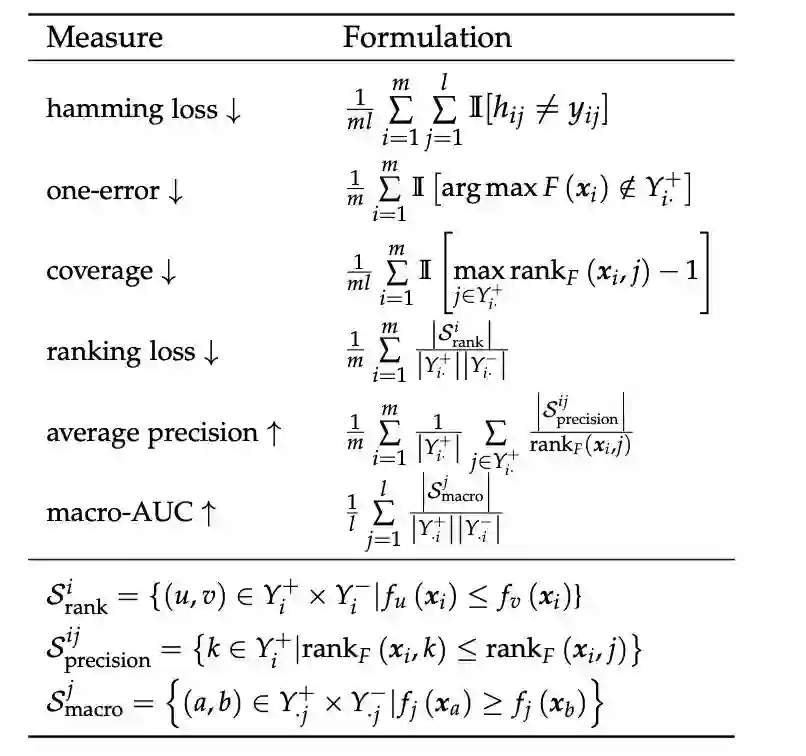 表1:六种多标签性能指标的定义:↓表示越低越好,↑表示越高越好。