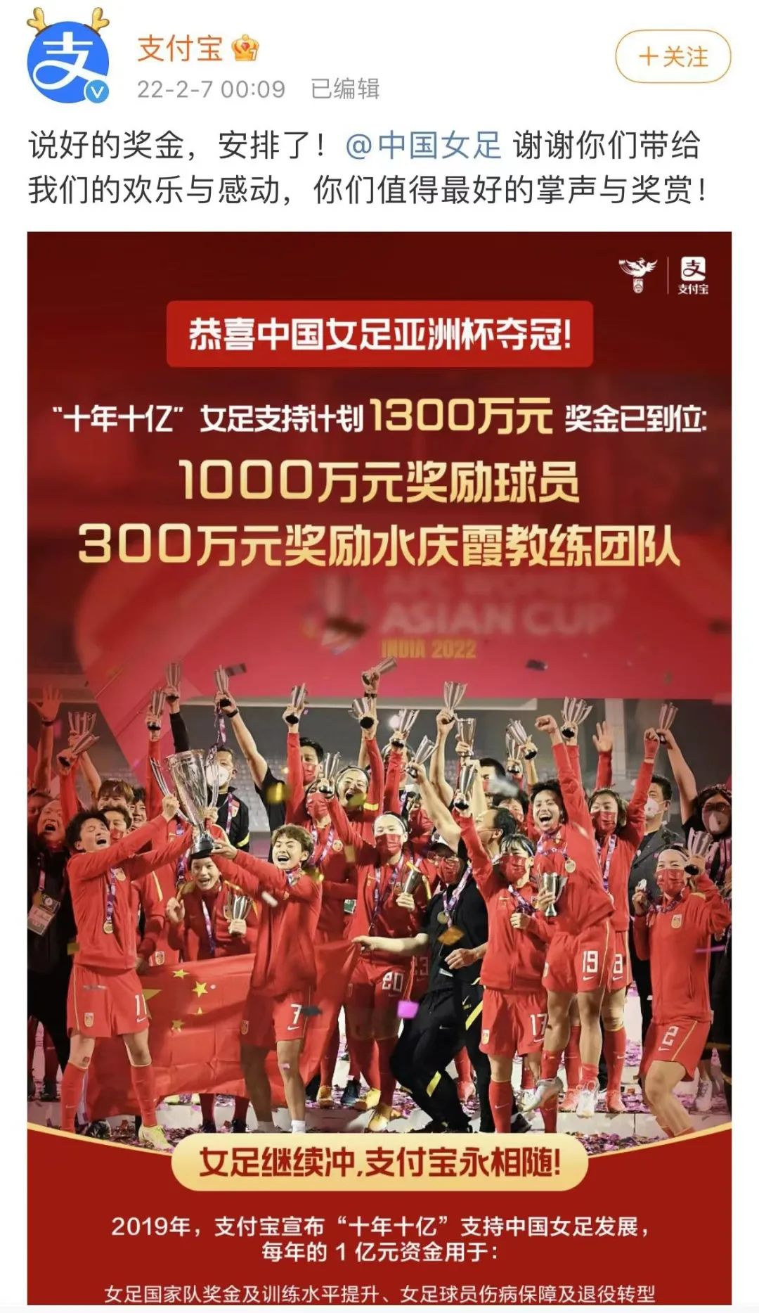 【蒙牛、支付宝千万奖励中国女足夺冠】2月6日晚,中国女足3比2战胜韩国队,第9次捧起亚洲杯冠军奖杯。中国足协中国之队官方合作伙伴@蒙牛乳业首个宣布,给予中国女足1000万元现金奖励。7日凌晨,@支付宝官宣给女足1300万奖金,其中1000万奖励球队,300万给水庆霞教练团队。(每日经济新闻)