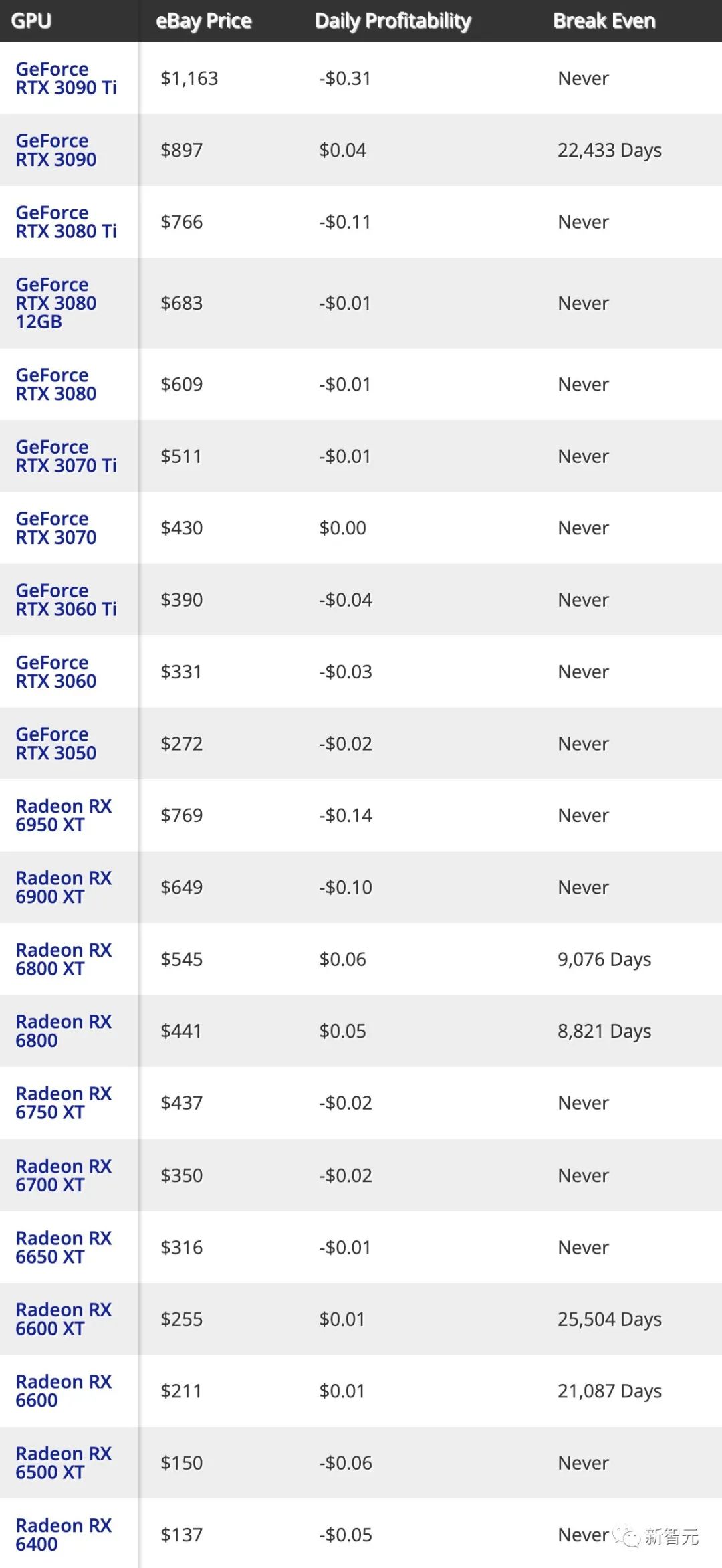 在AMD RX 6000系列和英伟达RTX 30系列的21个当前一代显卡中,目前只有五个在理论上是有利可图的(需要至少20年才能回本),而其余都处于亏损状态。