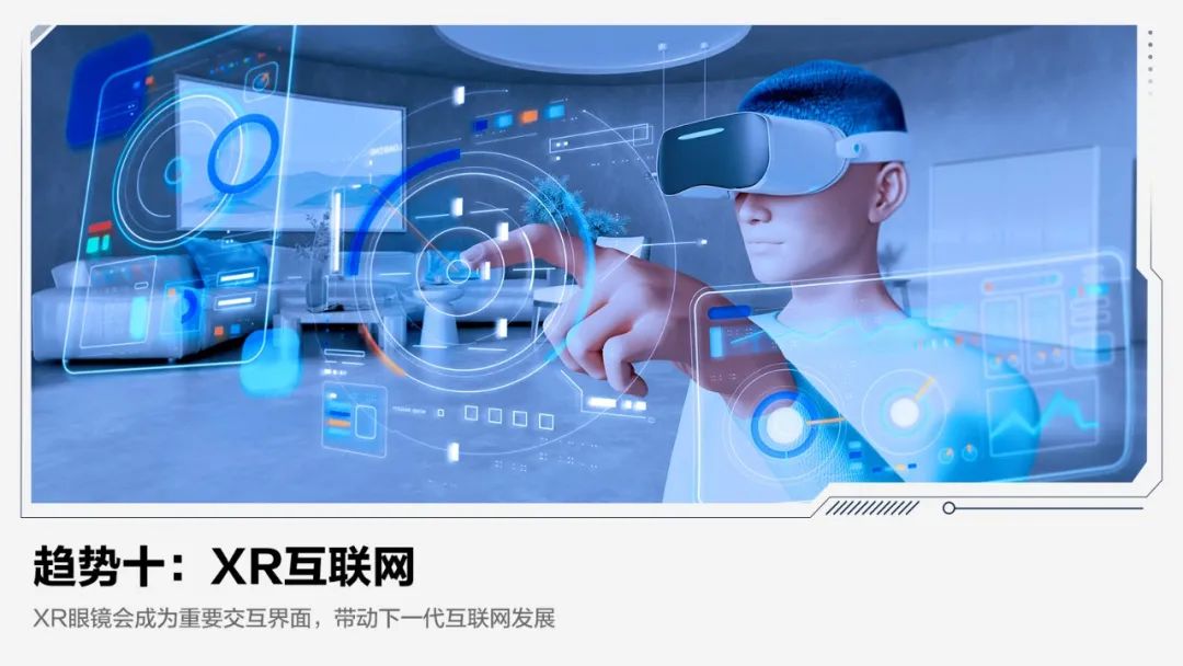 【趋势概要】随着端云协同计算、网络通信、数字孪生等技术发展,以沉浸式体验为核心的XR(未来虚实融合)互联网将迎爆发期。眼镜有望成为新的人机交互界面,推动形成有别于平面互联网的XR互联网,催生从元器件、设备、操作系统到应用的新产业生态。XR互联网将重塑数字应用形态,变革娱乐、社交、工作、购物、教育、医疗等场景交互方式。预计未来三年,外形与重量接近普通眼镜的新一代XR眼镜将产生,成为下一代互联网的关键入口。