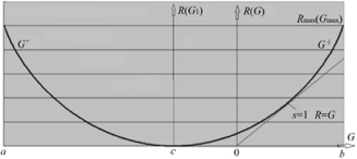 进一步结论:R(G)-G也是处处是凹的。所以山洼只有一个。求相对熵最小,就是求R(G)-G最小,就是找R=G的点,也就是上图中45度斜线和碗状曲线相切的点。