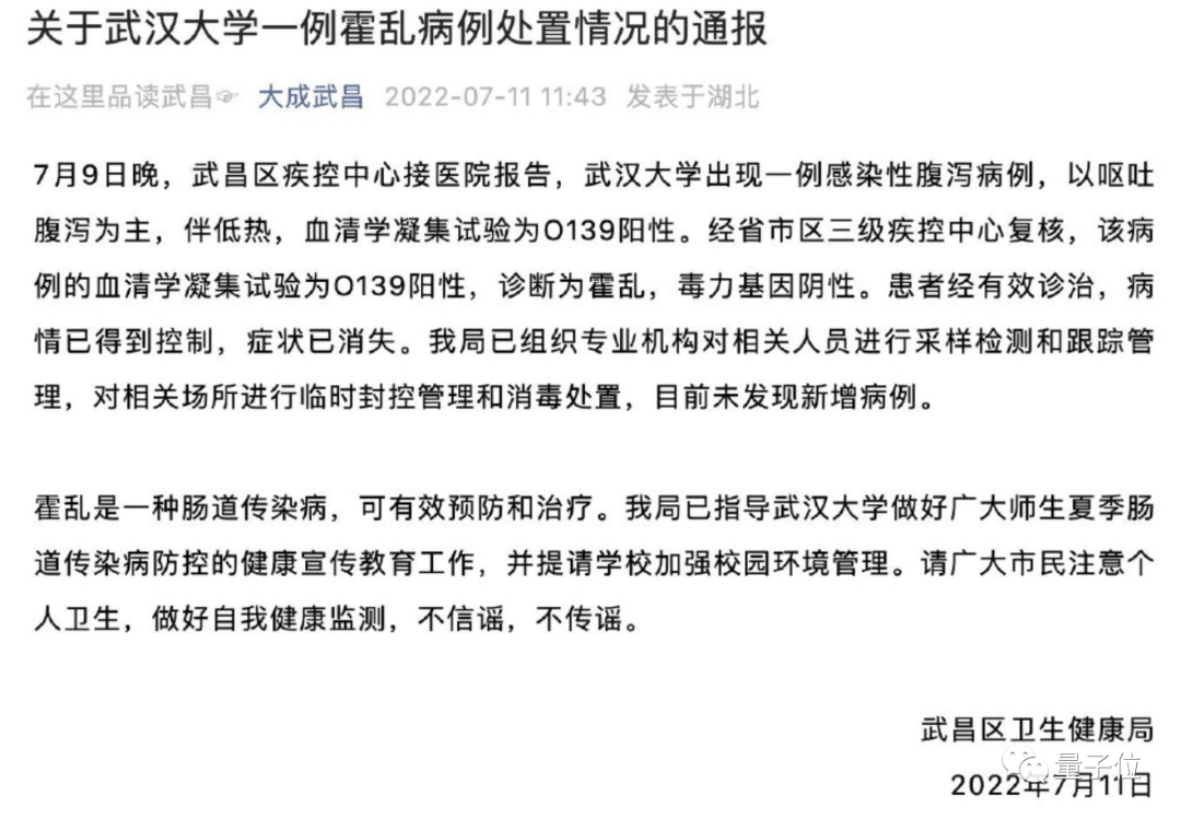 据悉,7月10日有网友爆料,武汉大学工学部宿舍疑似发现一例霍乱,并且全栋学生都进行了统一肛拭子检测。