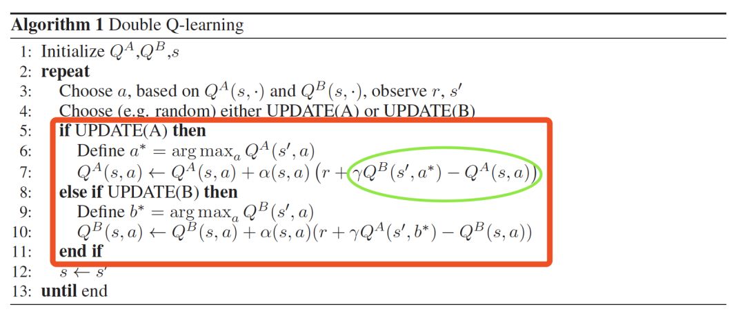 对比:此处对于Q-learning算法和double Q-learning 算法来说,double使用了B网络来更新A网络,同样的道理对于B网络则使用A网络的值来更新。