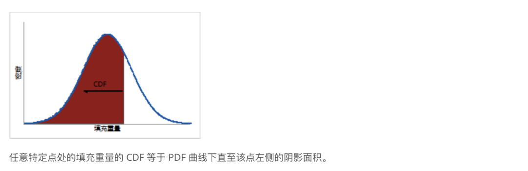 例如,罐装苏打水的填充重量服从正态分布,且均值为 12 盎司,标准差为 0.25 盎司。概率密度函数 (PDF) 描述了填充重量的可能值的可能性。CDF 提供每个 x 值的累积概率。此处参考PDF-CDF指导