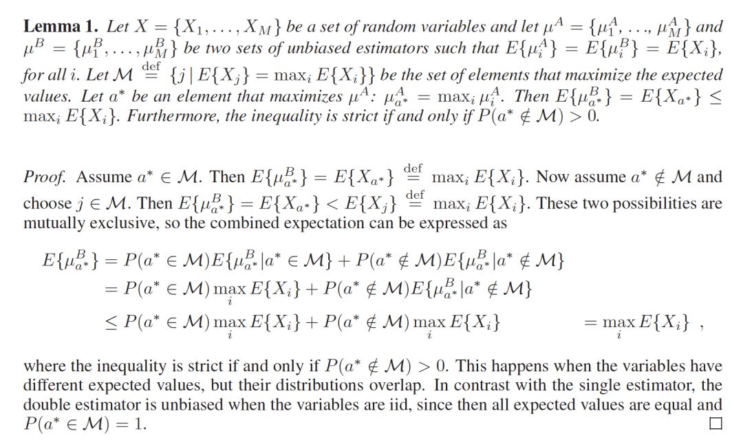 对于任意的 来说,最优值函数 的更新依赖于 , 从公式中可以看出,我们把N个Q值先通过取max操作之后,然后求平均(期望),会比我们先算出N个Q值取了期望之后再max要大。这就是overestimate的原因。