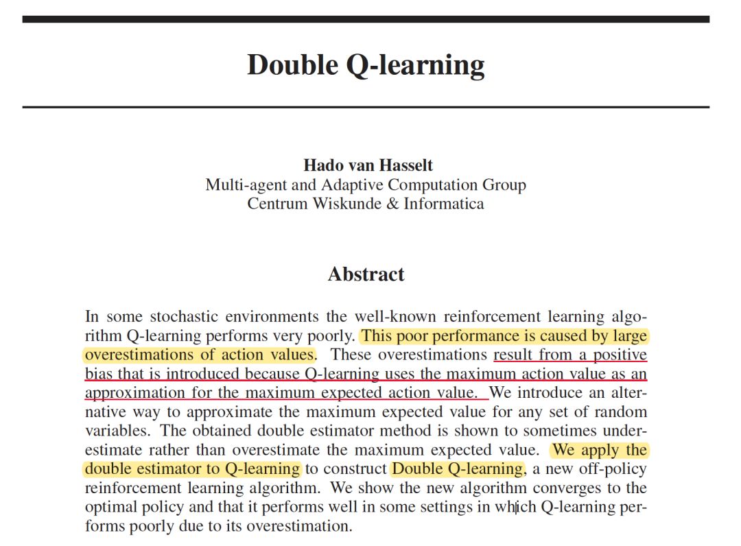 前言: Q-Learning算法由于受到大规模的动作值过估计(overestimation)而出现不稳定和效果不佳等现象的存在,而导致overestimation的主要原因来自于最大化值函数(max)逼近,该过程目标是为了最大的累计期望奖励,而在这个过程中产生了正向偏差。而本文章作者巧妙的是使用了两个估计器(double estimator)去计算Q-learning的值函数,作者将这种方法定义了一个名字叫“Double Q-learning”(本质上一个off-policy算法),并对其收敛过程进行了证明(缺点:当然double Q-learning算法有时会低估动作值,但不会像Q学习那样遭受过高估计)