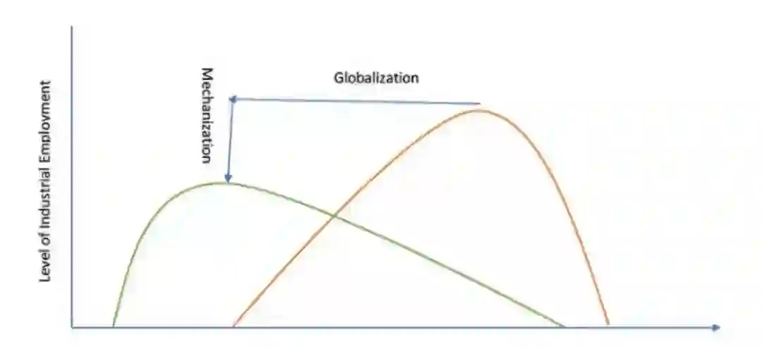 而发展中国家劳动力市场最大的担心,来自自动化对开放贸易的就业利益、投资等的冲击。换句话说,一些非洲和南亚国家无法再走中国和越南的路,朝着工业国家发展了。