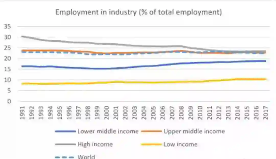 高收入国家,比如新加披、西班牙、葡萄牙,制造业就业率确实比1991年下跌了10%多,但相应的,服务业就业率在上升。低收入国家,则从1991年开始(到2017年),制造业在劳动力就业中的比重就一直在10%稳定,中上等收入国家这一比重维持在23%左右,中下等收入国家的这一比重(由于贸易开放和收入/需求增加)则经历了16.4%到18.8%的提升。
