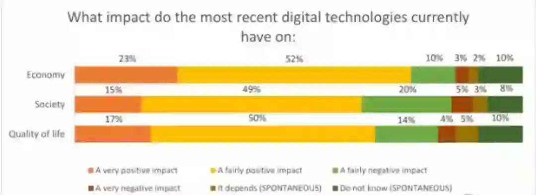 ▲欧盟调研《对数字化和自动化的影响的态度》(第一问:最近的数字科技在经济、社会和生活质量上的影响是积极的还是消极的?)