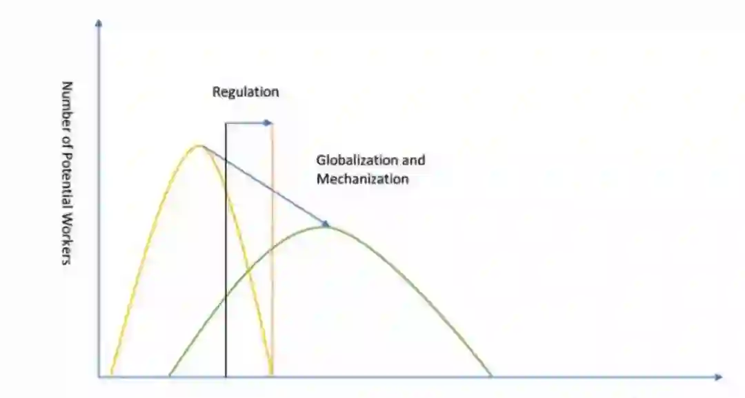 在这种工作本质的变化中,劳动力供求的平衡遭到了破坏。发展中国家,特别是非洲、中东和南亚,成千上万的年轻人加入劳动力市场,却面临着不确定的市场需求。大型正式私营企业仍然太少,且他们的发展仍然受到贸易壁垒、国内偏见、技术发展缓慢等问题的阻碍。