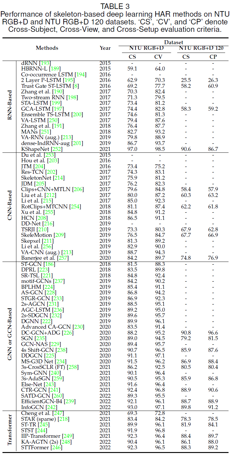 (2)骨架序列:编码人体关节的轨迹,当动作执行不涉及物体或场景上下文时简洁高效,具有尺度不变性、对纹理和背景变化的鲁棒性。对于骨架模态,最常见的四类深度学习网络是 CNN,RNN,GCN,和 Transformer。