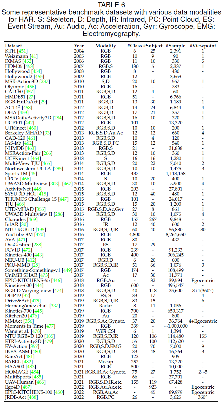 近些年来,大量的行为识别数据集被提出以训练和评估各种方法,该论文总结了适用于不同模态的基准数据集,并提供了其相关属性。
