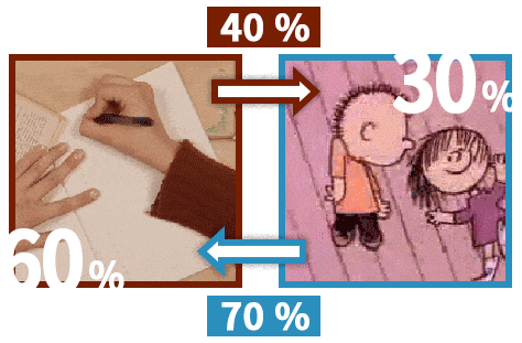 马尔科夫链说的是这么一回事。小明在每天下午 5 点的时候有两种状态:一、认真学习。二、愉快摸鱼愉快玩耍。如果他今天是认真学习,那么明天有 40% 的概率会在玩耍;而如果他今天这个时候是在玩耍,那他会因为羞愧难当,在明天有 70% 的概率会认真学习。我们现在想要看小明之后每天下午 5 点在干啥。