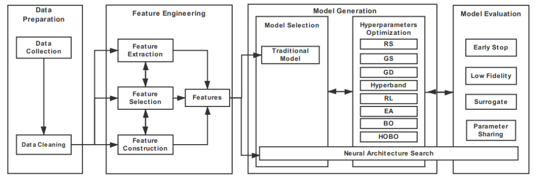 为了解决时间和资源成本的问题,使机器学习的整个流水线过程能够自动化的新想法应运而生,即自动机器学习(AutoML)。AutoML有各种定义。例如,根据维基百科,“AutoML是自动化端到端流程的过程,应用适当的数据预处理,特征工程,模型选择和模型评估来解决特定任务”。又比如,AutoML被定义为自动化和机器学习的结合。换句话说,AutoML可以自动构建具有有限计算预算的机器学习Pipline。