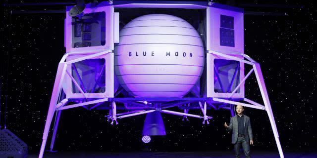 当竞争对手向着征服火星的方向努力,亚马逊老板杰夫·贝索斯创办的蓝色起源 (Blue Origin),却把目光锁定了距离我们更近的月球上。2019年5月9日,美国首都华盛顿特区举例白宫不远的公司总部,贝索斯召开了一场发布会,正式宣布了登月计划的更多细节。议程过半,台上的幕布缓缓拉开:蓝色起源花费多年斥巨资低调开发的大型登月飞船 Blue Moon,终于问世。