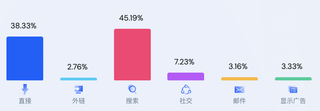 搜索流量最多,占了45%。其中自然流量和付费流量各占50%。自然流量就是Google的SEO优化,付费流量主要Google ads。