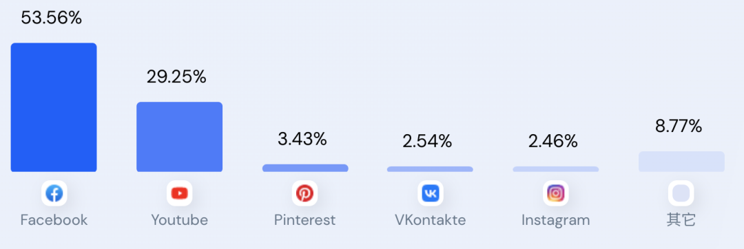 我们对SHEIN的社交媒体进行细分,可以看到Facebook的流量占到53%,是最多的流量渠道,其次是Youtube,接近30%,Facebook、Youtube这两个社交媒体就占到了83%以上。其他就是Pinterest、INS等渠道。