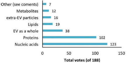 这一结果显示目前大部分人认为我们如此关注细胞外囊泡RNA和细胞外RNA是合理的。也可以看到,目前细胞外囊泡相关RNA以及细胞外RNA的研究相比其他成分有更多的报道,另外目前处于研发阶段或已经上市的临床相关产品中细胞外囊泡相关RNA和细胞外RNA的产品也更为常见。但这些也可能是由于目前技术发展不均衡所导致的,应该指出的是,目前核酸的检测和测序技术十分发达和先进,但是对于蛋白、脂质等成分的检测和分析技术还需要长足的发展。