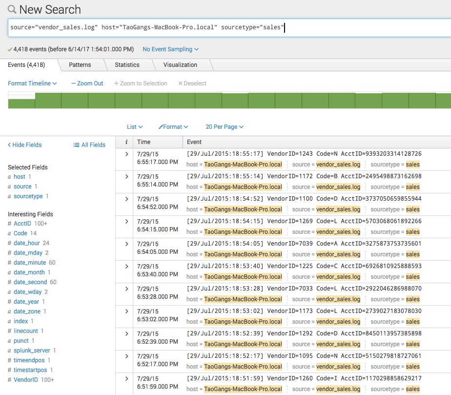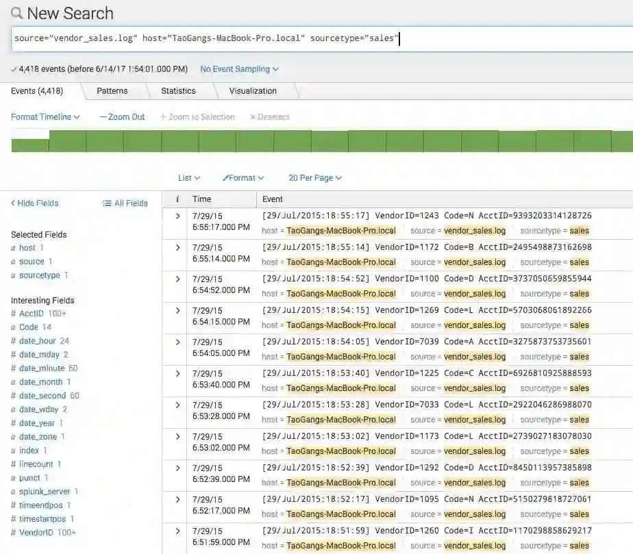 对应于Elastic的文档,Splunk的数据索引的基本单元是事件,每一个事件包含了一组值,字段,时间戳。Splunk的事件可以是一段文本,一个配置文件,一段日志或者JSON对象。