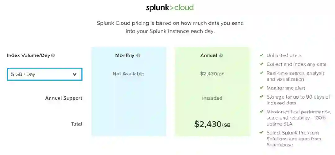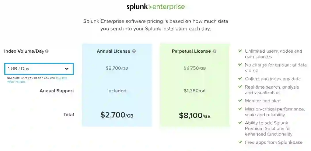 Splunk Enterprise是按照数据每日的流量按年或者无限制事件付费,每天1GB的话,每年是2700美元,每个月也是差不多200块。如果每天的数据量少于500M,可以使用Splunk提供的免费License,只是不能用安全,分布式等高级功能,500M可以做很多事情了。